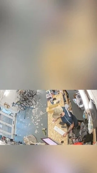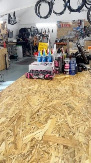 A person adjusting a bicycle wheel on a truing stand in a workshop, surrounded by tools and equipment on a wooden workbench.