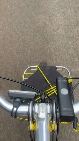 Workshop with tools on a wall-mounted pegboard, bicycles, and a workbench in a garage setting.